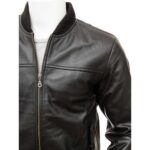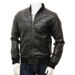 A clean and simple black, leather bomber jacket. Sheep nappa leather is the perfect hide for this jacket with a soft and supple handle and a deep colour density. The styling follows the MA1 template of a blouson body, rib knit collar, cuffs and hem plus flapped waist pockets. Everything you need in a jacket and nothing more. The interior is fully lined in a plain poplin and carries one leather trimmed pocket.